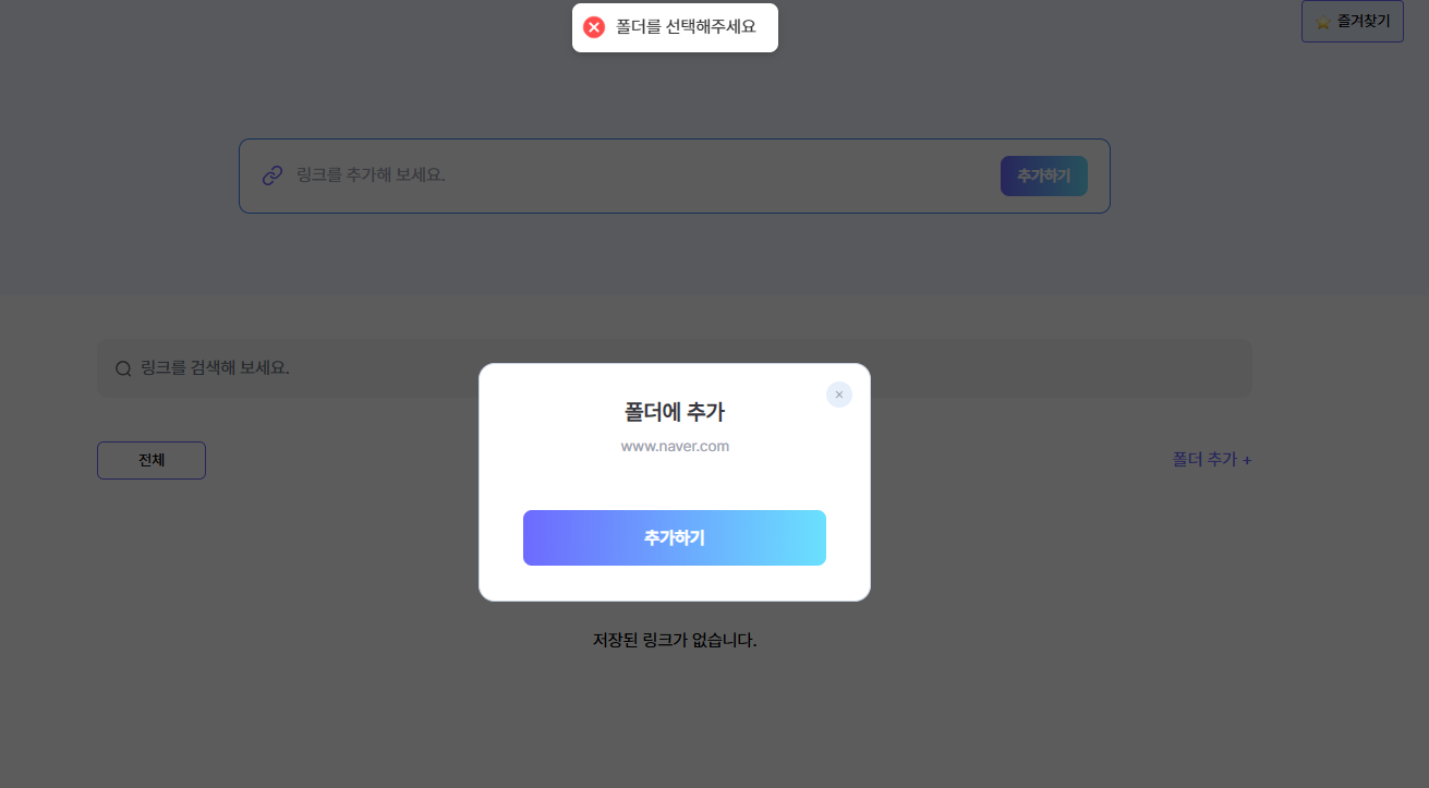 그러나 링크를 추가할 폴더를 선택해야하기 때문에 에러 토스트를 만나게 된다.