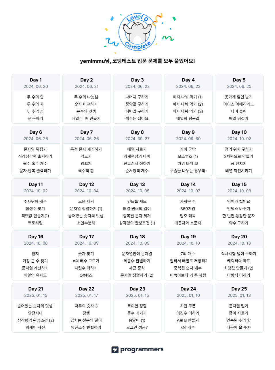 ✅프로그래머스 코딩테스트 입문 100문제 풀이 완료