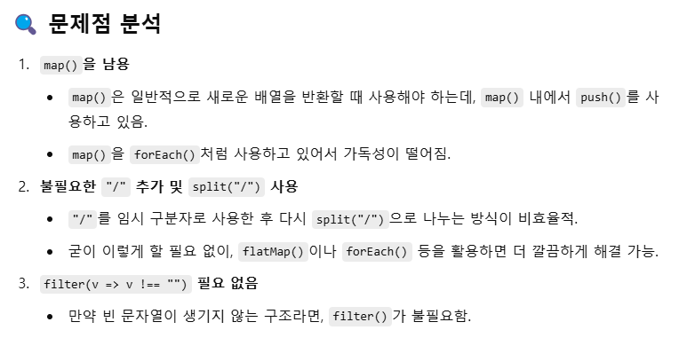 flatMap 을 사용하면 평탄화한 결과를 반환하여 쓸데없이 "/" 를 더했다가 split했다가 빈배열"" 을 filter할 필요도 없다고 한다 ^ ^