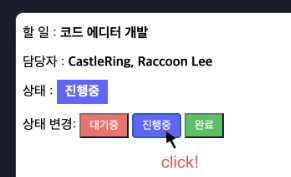 btn class를 갖는 태그를 btns에 할당한다. = [button, button , button ] btns의 요소를 순회하면서 { 각 btn의 status 속성값(=대기중, 진행중, 완료)을 변수 status 에 할당한다. btn을 클릭 이벤트 발생 시 함수 동작 : fields의 [2]번 인덱스 요소(상태 : <b>)의 내용(='status') 에 status 할당 setAttribute로 'status'속성값을 status 로 넣는다 } 즉 첫번째 btns 요소 : <button> 이것의 status 속성값 = "대기중" -> status 변수에 할당 <button> 클릭 시 동작 : fields의 2번 인덱스 = <b> 태그의 내용을 status 로 바꿔라 <b> 태그의 status 속성의 속성값을 = "대기중" 으로 바꿔라 |
